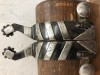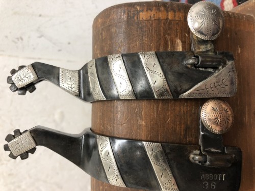ABBOTT 36 marked spurs by Texas cowboy Larry Abbott. Hard to find his spurs for sale and especially an unworn pair of shorter shank and smaller rowel ones. These have been put away for several years and are excellent with 1" bands, 1 3/4" shanks, 3/4" rowels, 3 1/8" heel openings. These will fit many lady’s boots as they are or can be opened some to fit some men’s boots. I believe that they are forged one piece spurs and probably sterling mounted. We pay shipping within the 48 states. We accept most forms of credit cards, Pay Pal, money order, or check.