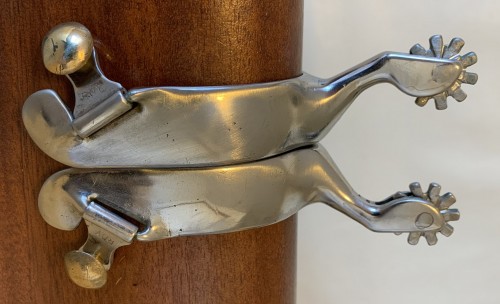 Measurements: Heel Band Width 1”, Shank 2”, Rowels 1”, Heel Opening approx. 3 ½”, Weight of Both Spurs 15 ounces