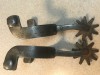 Rare pattern; collect or use. 3/4" heel bands, 2 1/2" shank and 2" 9 point rowels. Maker stamp clearly visible on both spurs.