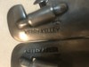 Kerry Kelly spurs in new condition, I doubt if they’ve ever been used. Kerry Kelly is in Weatherford, TX and his bits and spurs are in high demand in the Cutting, Reining, Roping and Showing circles as well as in cowboying, whatever the job. This pair features a 1" heel band, 1 3/4" shank and a 1" rowel. Maker stamped KERRY KELLY and Made in USA (above the EY in KELLY)
