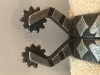 Randy Butters No. 223 single-mounted card suit spurs; R.Butters is stamped under the inside button on both spurs. This pair has a 5/8" heel band, 1 7/8" shank and 1" rowel. Randy’s spurs are hand-made and high quality.