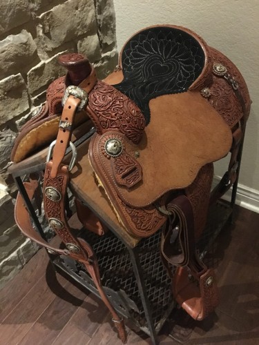 New 7/8 tooled Rick Whorton roping saddle. 14.5” tree on a Hogg Tree. Custom silver conchos, D rings and buckles. 3 3/4” candle, never been roped on. Fits a horse like one should.