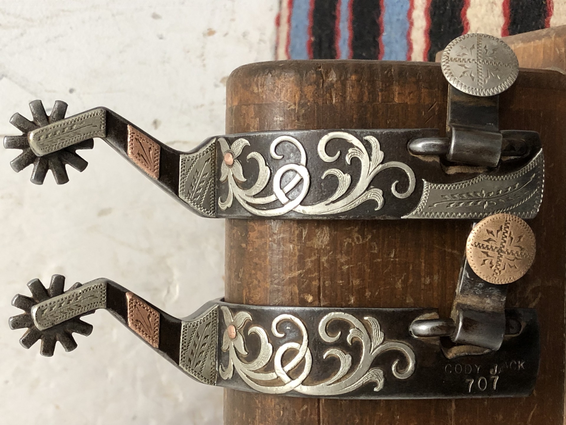 CODY JACK 707 marked spurs made by Texas panhandle maker Cody Jack. Made with 1" rowels, 2" shanks, 1" bands, 3 3/8" heel openings. Spurs in good used condition. Just a little play in the rowels. Nice double mounted pair. We pay shipping within the 48 states. We accept most forms of credit cards, Pay Pal, money order, or check.