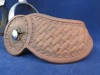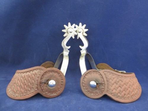 Pair of crockett marked bottle opener spurs. The heel bands are 1/2" wide with a 3 1/2" spread. The shasnks are 2 1/2" long with 9 point 1 3/4" rowels. Marked Crockett in the #4 position, late 1940’s. Nice hand made basket weave straps.