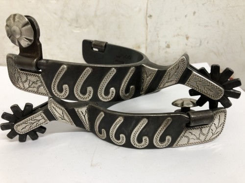 Great pair of spurs by Mr. Ray Anderson and marked RAY ANDERSON 900. This is the 900th pair that he made and numbered. Unworn, mounted with sterling, 1 1/4" rowels, 2 1/8" shanks, 1" bands, 3 7/16" heel openings. made on the Bayer’s #4 pattern. Classic pair by one of the best of the contemporary makers. Mr. Ray it 92 and has not made for years. He started making in the early 1970’s and only 1500 and some pair. Great using pair with collectibility. We pay shipping within the 48 states and accept most forms of payment.