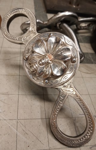 I am the maker of this bit. It is sterling silver on iron with a 2" concho. There is a 3 dimensional solid sterling flower coming out of the middle of the concho with a bumble Bee in the flower. The cheeks are 5 1/2" and the mouth is 5 1/4" with copper inlay on the underside. These bit ride well and get a lot of attention. I have made a couple of other bits in this style and the people who own them tell me they receive a lot of compliments on the bit.