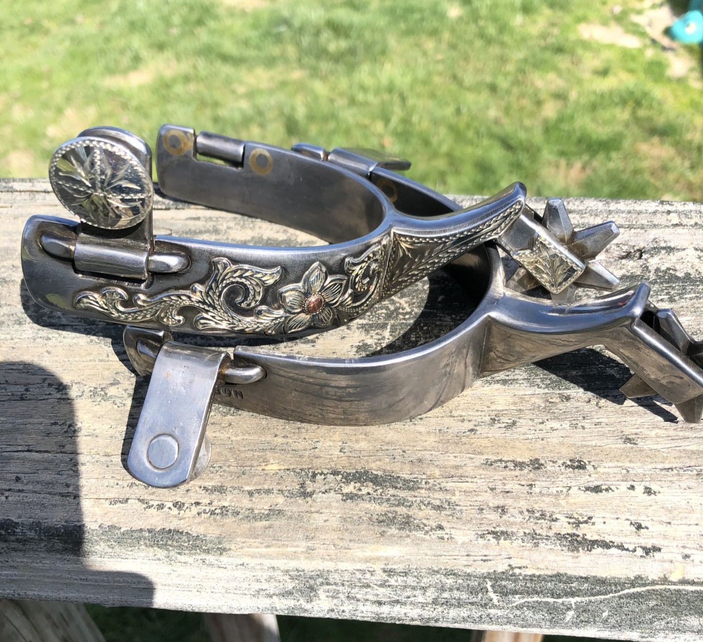 New/Unused spurs handmade by Jesse Lawson. Really nice pair of spurs mounted with engraved floral scroll and bars on shanks. 1” band. 2 1/8” shank. 1 3/8” 6 pt rowel. $550 shipped in lower 48. PLEASE TEXT OR CALL ONLY. Thank you.