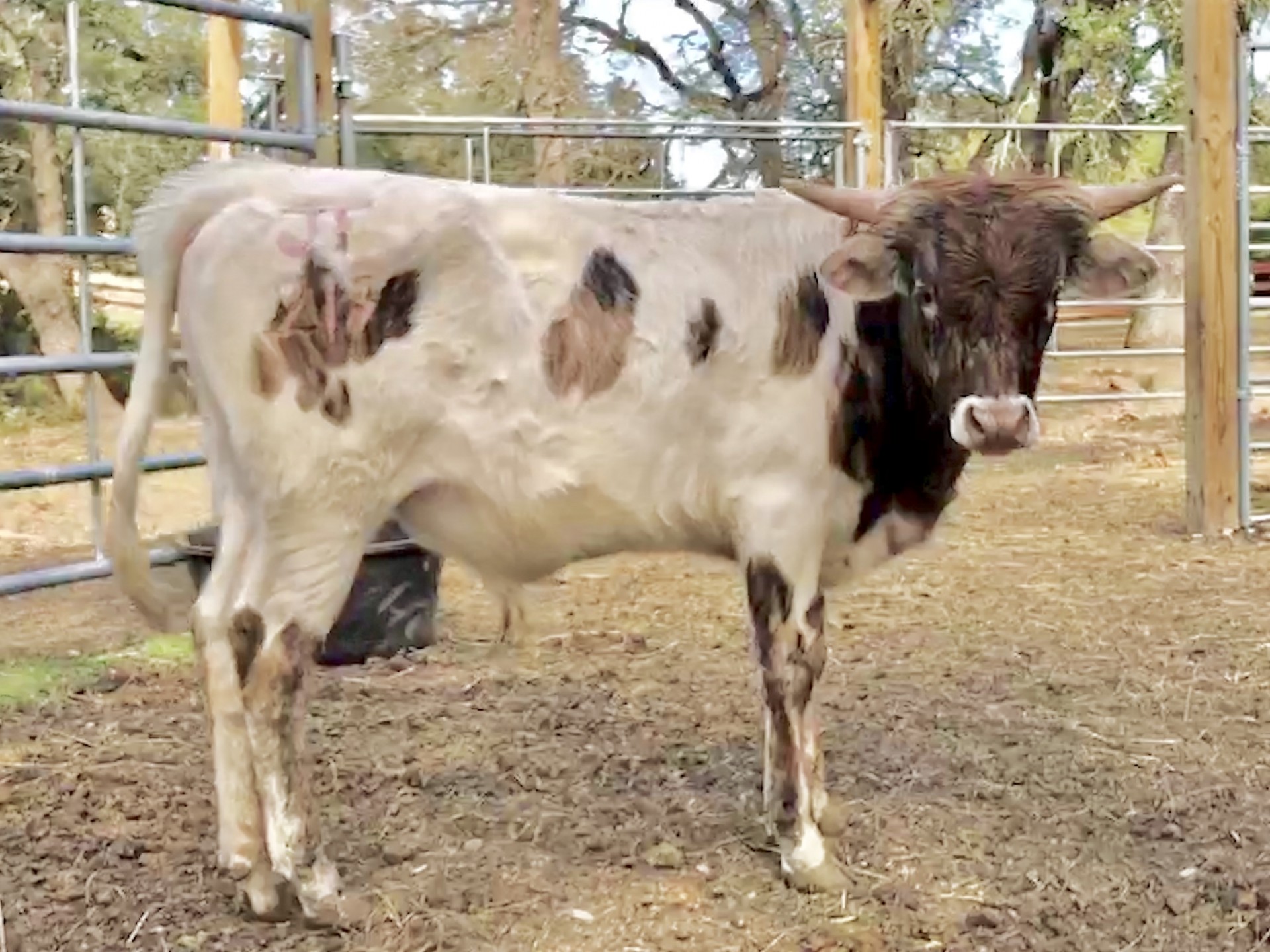 JT Weston is a handsome bull calf from Star Creek Ranch genetics. He is the first calf of his dam, Vibrancy of Stars, a beautiful parker brown. And his sire is Lucchese Star out of Kinetic Motion of Stars and Cowboy Tuff Chex, both with horns measuring over 100" TTT. Weston is a dark parker brown. $450