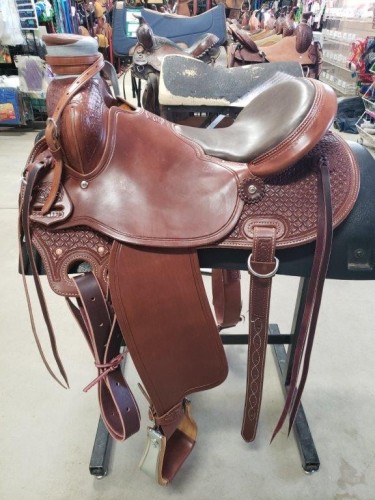 This medium-oil saddle is finished with a rough-out seat, seat jockey, and fenders. This saddle is completed with minimal tooling and saddle strings. It comes with a back-cinch.