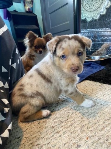 Roper is 3/4 Australian Shepherd 1/4 Heeler. He’s a gorgeous red Merle and has a beautiful conformation, much like his father He has an awesome personality and loves to be playful. He is gorgeous much like his mother and father, who are excellent working ranch dogs.