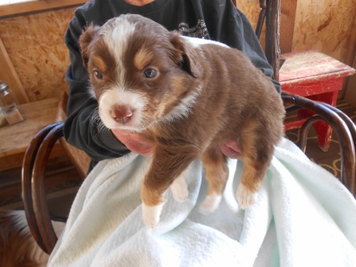The puppies in this litter are from AKC-Registered parents and can also be registered with the AKC. Seven puppies available, three males and four females. These puppies have been hand-raised and well-socialized in a family environment. Father is a working stock dog. Puppies are bright, eager to learn, and have a good disposition. Color variations on red, some with white collars, some with bright blue eyes. $900 per puppy, with a $500 non-refundable deposit.