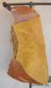 This is a lightly used pair of handmade step in bell chaps made by Gerry Gesell of El Dorado, Texas that have only been worn a couple of times. They are not maker marked. Gerry builds quality chaps and he did an awesome job on these chaps. These chaps have a lot of nice detail and unique features. The body of the chaps are made out of heavy duty honey latigo leather rough side out and they are trimmed in the same leather smooth side out. The right leg has an inside pocket and the left leg has a combination inside and slip in pocket. The pocket has a flap that closes with a strap and nickel cart buckle. Underneath the flap are six cartridge loops that will fit a 38 cartridge. They have a latigo belt with a nickel buckle, nickel plated tie ring, and twenty stainless conchos. There are antler horn buttons at the front tie. These would be a great pair of using chaps.