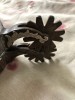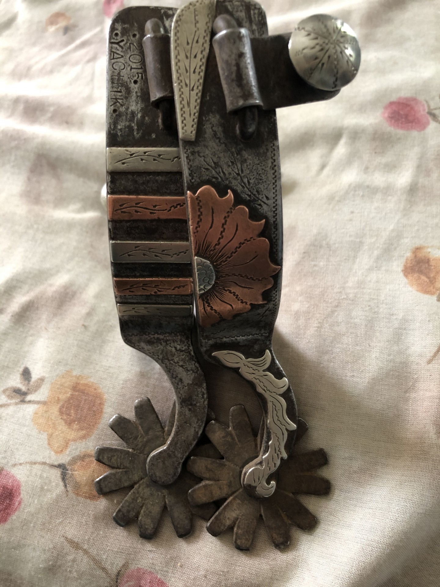 Excellent condition used pair of double mounted spurs handmade by Jason Yachik. Everything is tight w no issues. Mounted w engraved copper an silver. Lots of engraving on metal Also. 1” band. 2” shank. 1 3/4” rowels. $450 shipped in lower 48. PLEASE TEXT OR CALL ONLY. Thank you