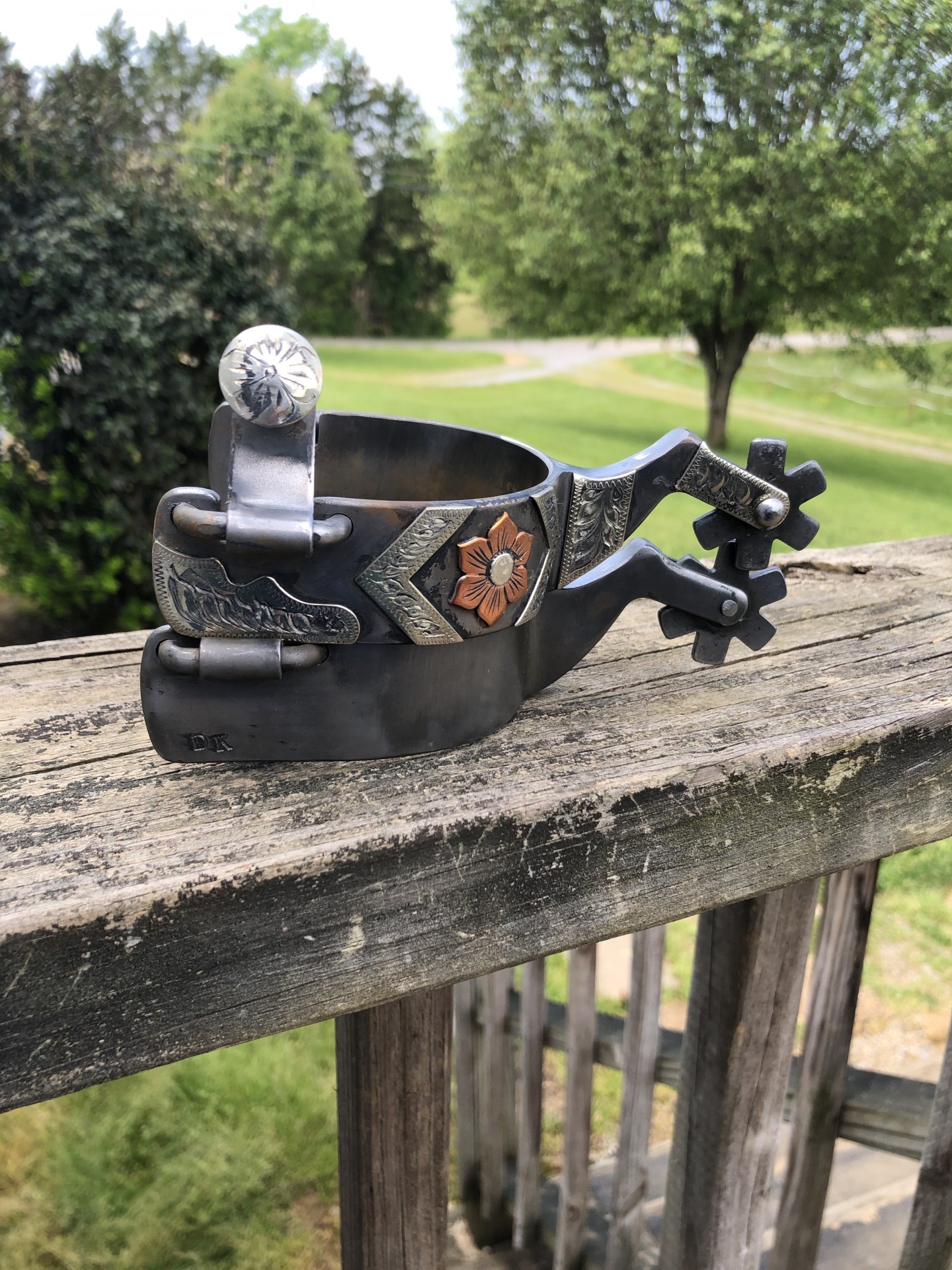 Nice pair of single mounted spurs handmade by Danny Kaufman. Mounted with engraved silver and copper. Like new condition. $400 shipped in lower 48. PLEASE TEXT OR CALL ONLY. Thank you