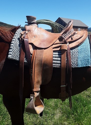Has been a great heavy duty using saddle. Has fit a variety of horses. Only selling because I want a swell fork. Asking $2500 plus shipping. Stirrups, front cinch, and cantle concho not included. I will put on a new horn wrap in the likely event that buyer isnt a lefty like me.