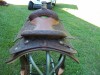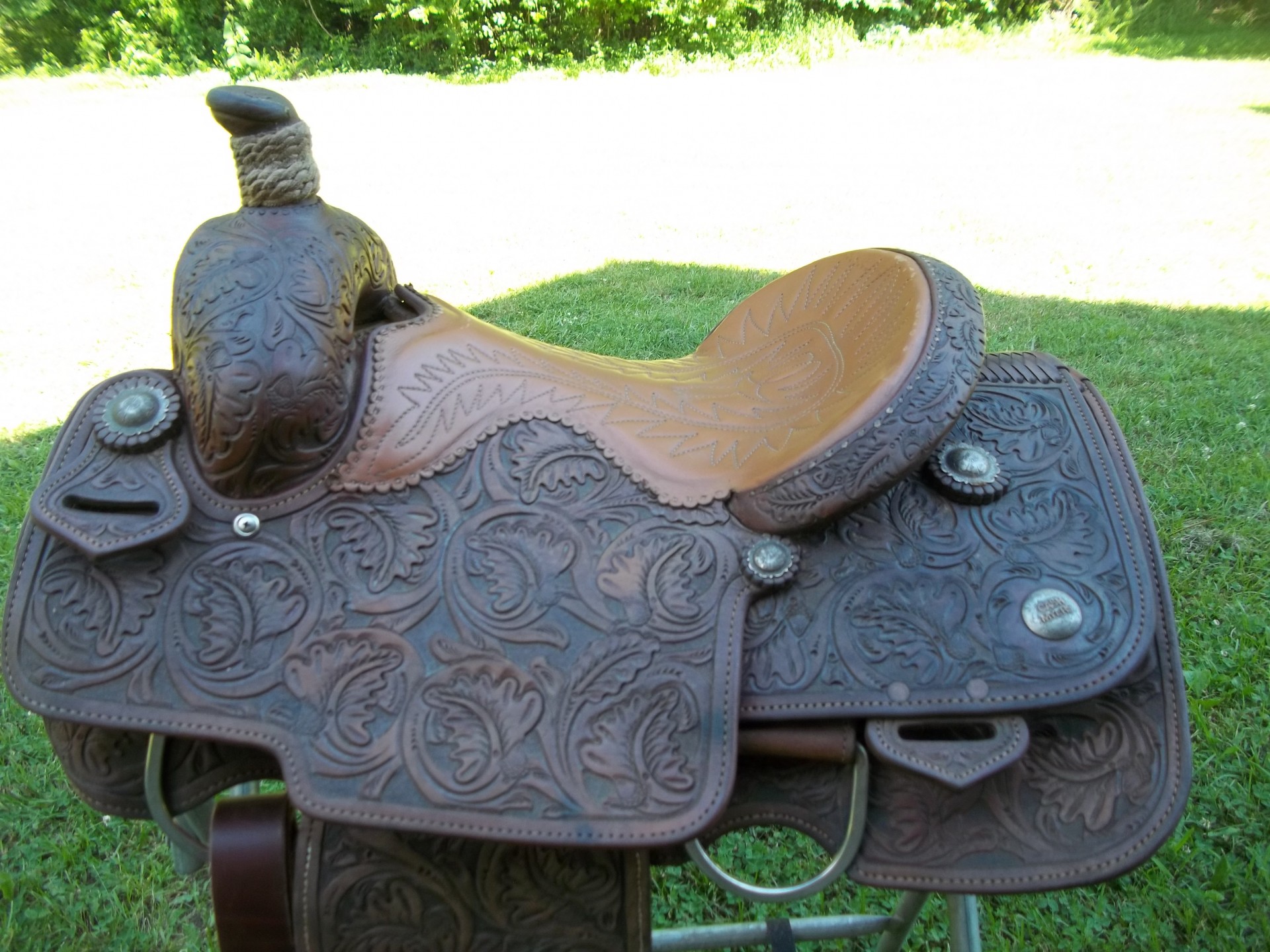This roper was made by OTT Ranch in Oklahoma. The conchos on the lower top skirt read Cash Myers. The padded seat is 14 1/2 inches and super comfortable. The overall skirt length is 26 inches with a 2 1/4 inch horn cap, and a 3 inch cantle. The entire saddle is acorn and oak leaf tooling. The stirrups are new rawhide covered ropers with a 3 1/4 inch tread. There is no back cinch or front girth. The horn and tree are tight. We only accept Paypal and ship Priority mail.