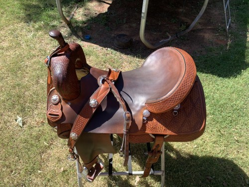 Chet Koen Saddle. Semi Rough Seat. Aluminum Heels Down Stirrups. 2 breast Collars. One is brand new. Very Comfortable