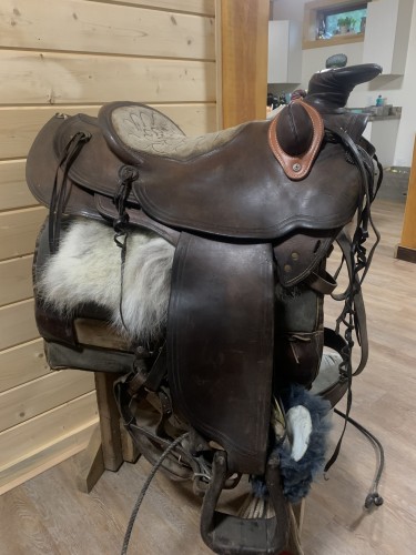 Good condition, solid tree, sheepskin in good shape, leather wrapped stirrups, large horn, wrapped with leather, original seat, all saddle strings are still there. Never came with a back cinch but has the slots to add one.