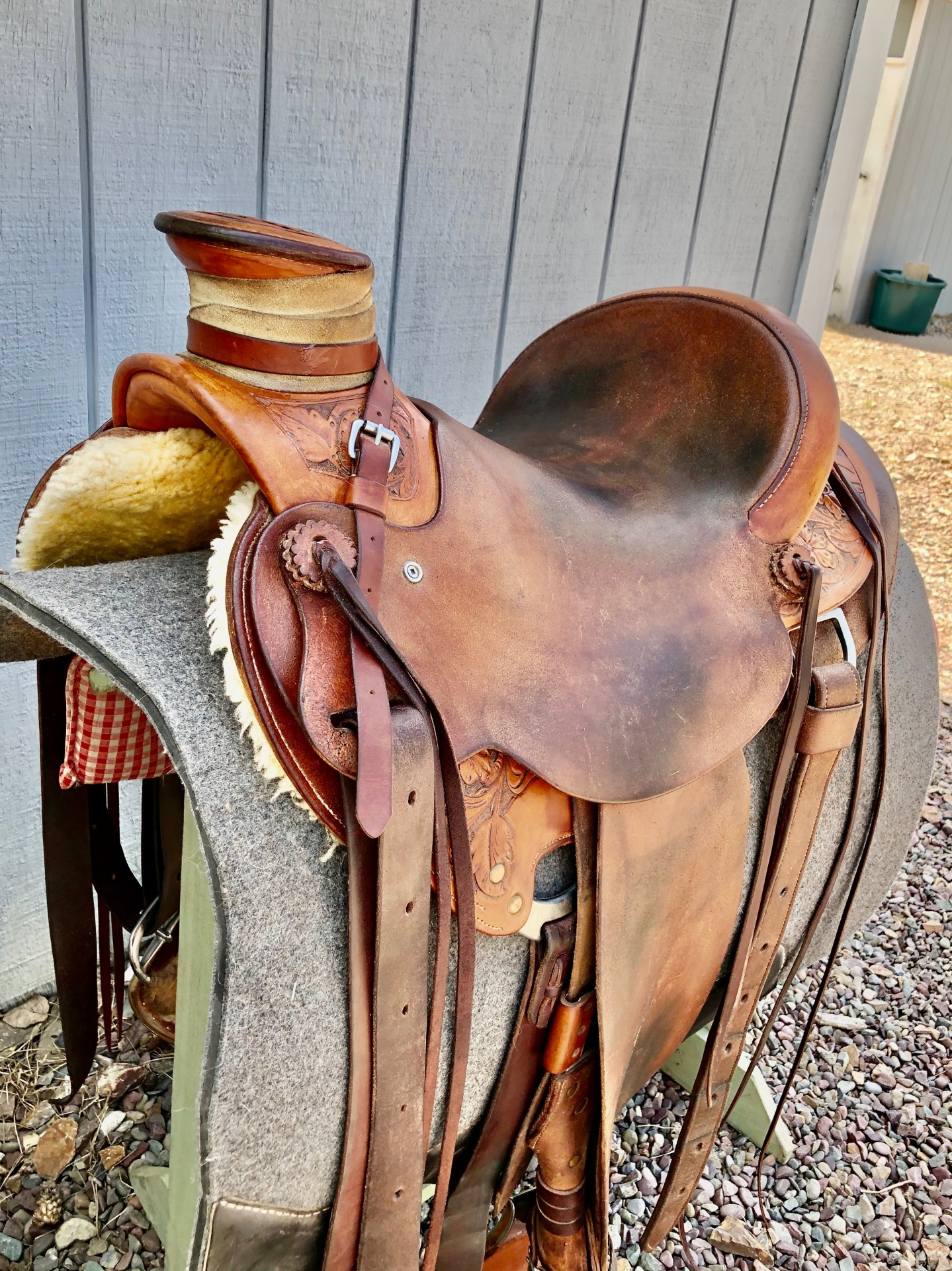 The saddle has a Warren Wright tree with a 12 3/4 front flare that fits most horses. It has a 7/8 flat plate rigging, twisted stirrup leathers with stainless wide stirrups and a Cheyenne roll. The saddle is sheepskin lined with long saddle strings, and antique finished floral tooling. It comes with a rear chinch and very comfortable original rough out seat.