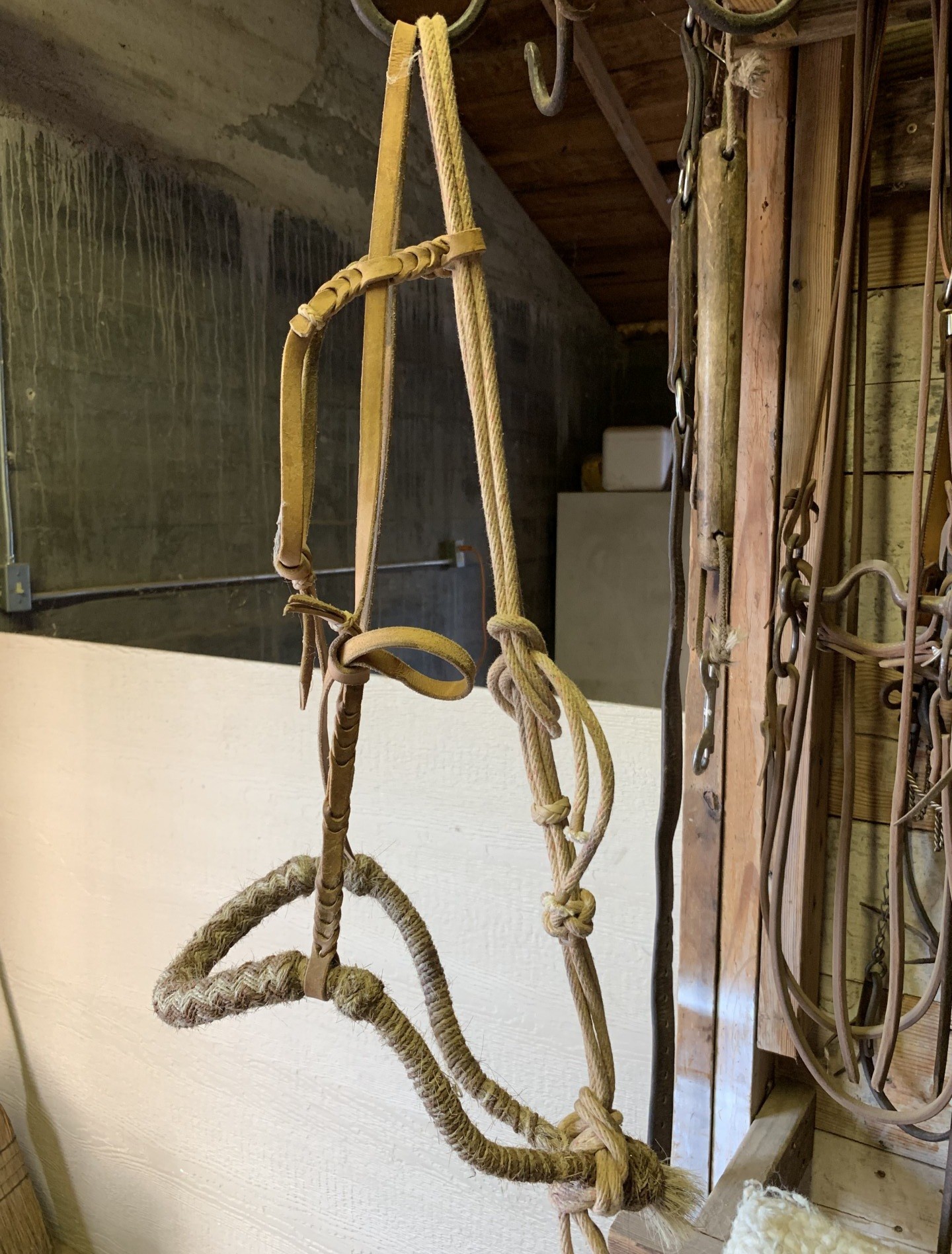 I have a hackamore for trade. The brown and white hackamore is made from horse hair. Billy made the hanger and the fiador but her did not build the noseband. All it needs is a mecate and it’s ready to go.