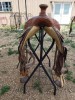 This trophy saddle comes rough out seat jockey and fenders, rawhide cantle with silver lacing. It is accented with acorn and leaf tooling and saddle strings.