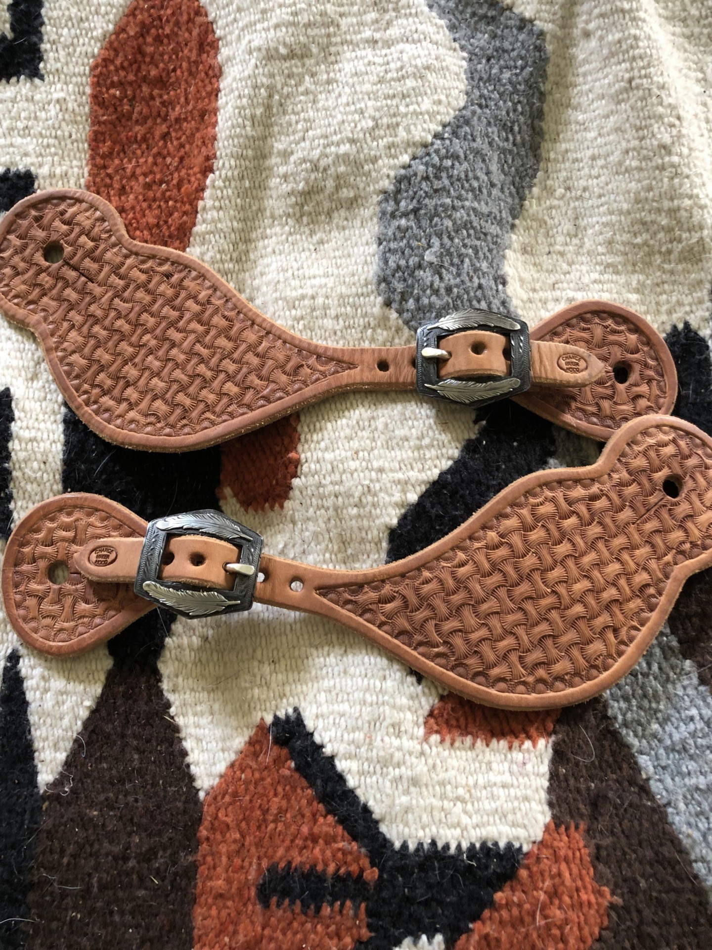 New good heavy stamped spur leathers handmade by Chance Hood. Buckles by John Jennings. Buckles are mounted w engraved silver feathers. Also lots of detailed engraving in the metal as well. $225 shipped in lower 48. PLEASE TEXT OR CALL ONLY. Thank you