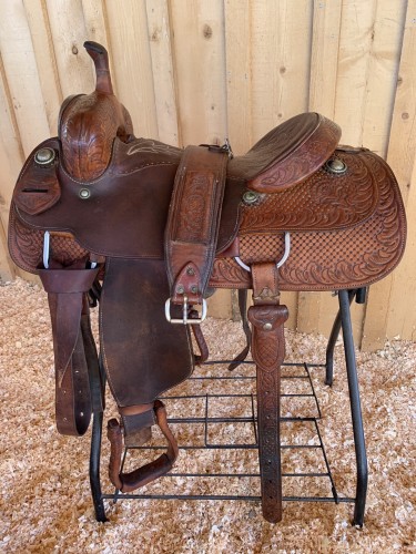 Beautiful craftsmanship, well maintained and in excellent working condition. Full Quarter Horse bars, rawhide covered tree and sheepskin fleece in great condition. Comes with fancy matching back cinch.
