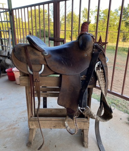 Older 16” Jeff Smith ranch saddle. Good used condition, oiled and kept inside. Fits a wide range of horses well. Comes as pictured, with front cinch and stirrups included. I will pay shipping or meet you if you are within reasonable distance. Call or text for any questions