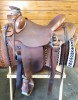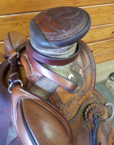 3" x 3" Horn, Mule Hide Wrapped Cross Over Rope Strap, Breast Collar D Rings,Stainless Steel Hardware,Wrapped /Turned Stirrup Leathers,Blevins Buckles,hand Braided Hobble Ring,3" Tin Bound Stirrups match tooling,Bucking rolls, matching breast collar, rear cinch