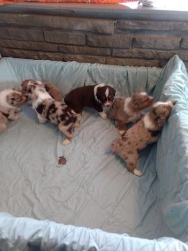 Litter of 6 born on July 9th to my stud pictured. Available now 1 Merle Female. Tails/dew claws done, wormed at 2 weeks old, will have first shots on Aug. 14th. Dam is a Liver Merle w/ blue eyes. Both parents are dbl reg. and have full gentic testing/copies provided on purchase. Not sold with breeding rights. Both parents work cattle on my ranch, have used Aussies for over 40 yrs ranching.