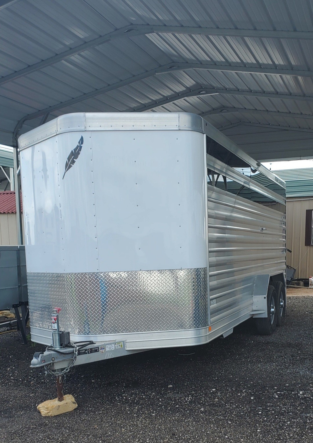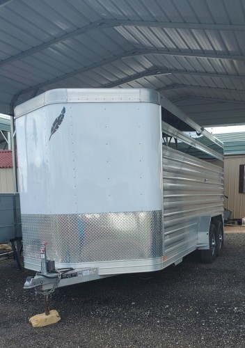 Featherlite. 2018. 20 ft.Bumper pull. Custom ordered with upgrades to haul a wagon (last pic), 2 mules, and a horse. Upgrades include: extra wide, larger 16 inch wheels with 8 lugs, floor mats, and LED lights. Has a divider at 11 feet.