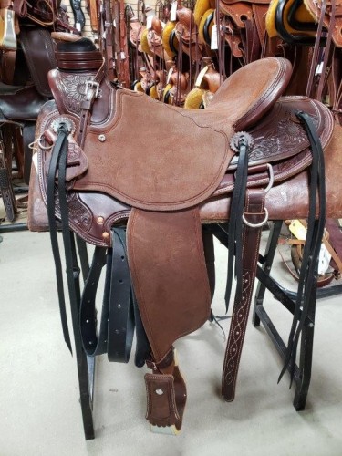 This lightweight Wade Saddle is dark oil with black saddle strings and..... SUNFLOWER tooling! It has a hard seat, wrapped horn and comes with back cinch.