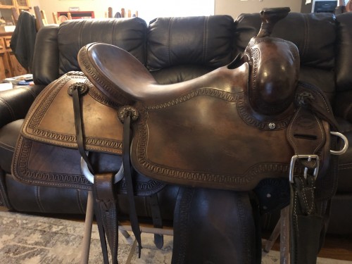 15 3/4 inch Southwest Will James built by Tad Sanders for sale. 3 inch cantle with a Cheyenne roll. 3 1/8 inch tall horn with a 2.75 inch cap. Flat plate rigging,slick out leather with snake border tooling. Matching breast collar with snake border available for an additional cost. Used saddle in great condition. $2750