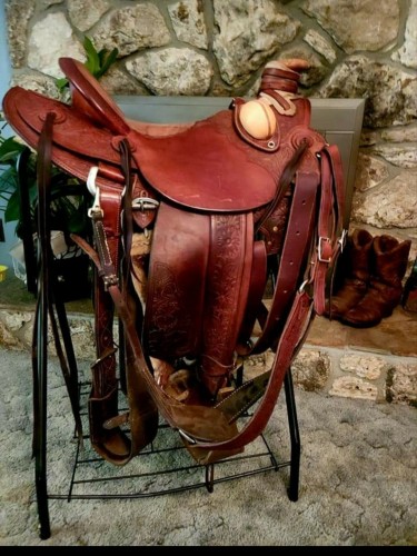 Custom McCall Lady Wade with exposed stirrup leathers, padded inlay seat, brass monel stirrups, breast collar, and new bucking rolls. 15.5" finished seat with FQHB. Asking $2850, offers considered
