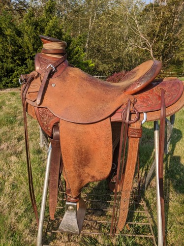 Freckles saddle made by Levi Johnson. 15 1/2 inch seat. Roughout seat and fenders. Monel stirrups. It’s a little scuffed up on the left side of cantle and horn. FQHB’s