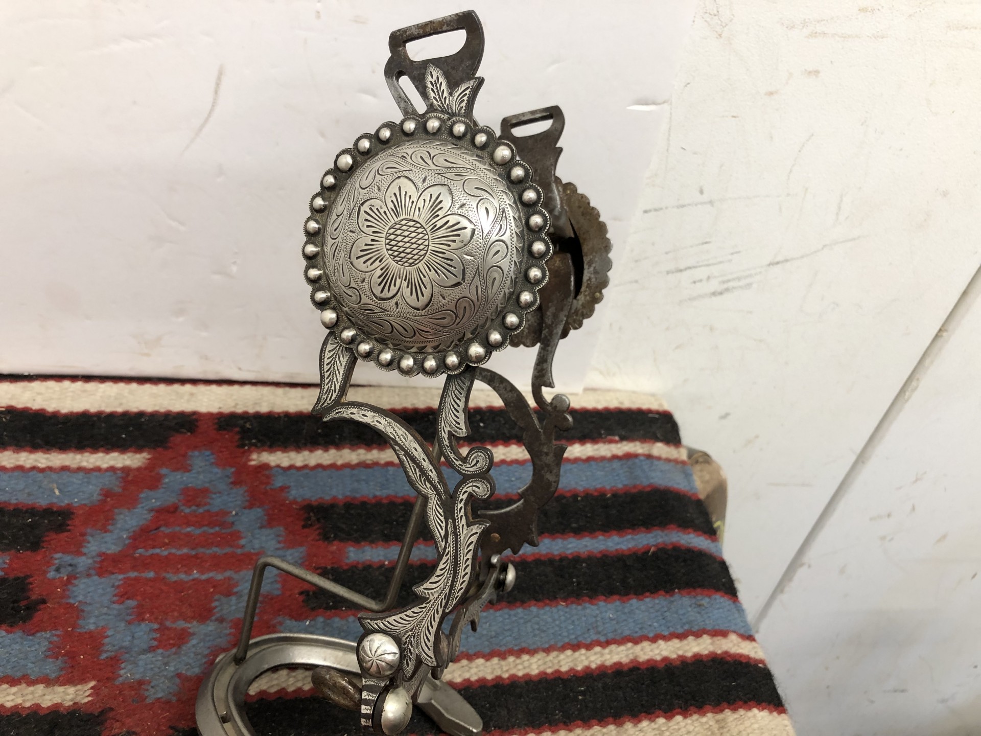 E.G/S.F marked bit from El Gato. This is one of their early marks. Top notch engraving on this bit with 3 3/8" conchos, 8 3/4" cheeks, 5" mouth. Bit has sure been ridden, has some play, not worn out. Like the butterfly in the lip bar. This is a very nice collectible bit. We pay shipping within the 48 states and accept most forms of payment.
