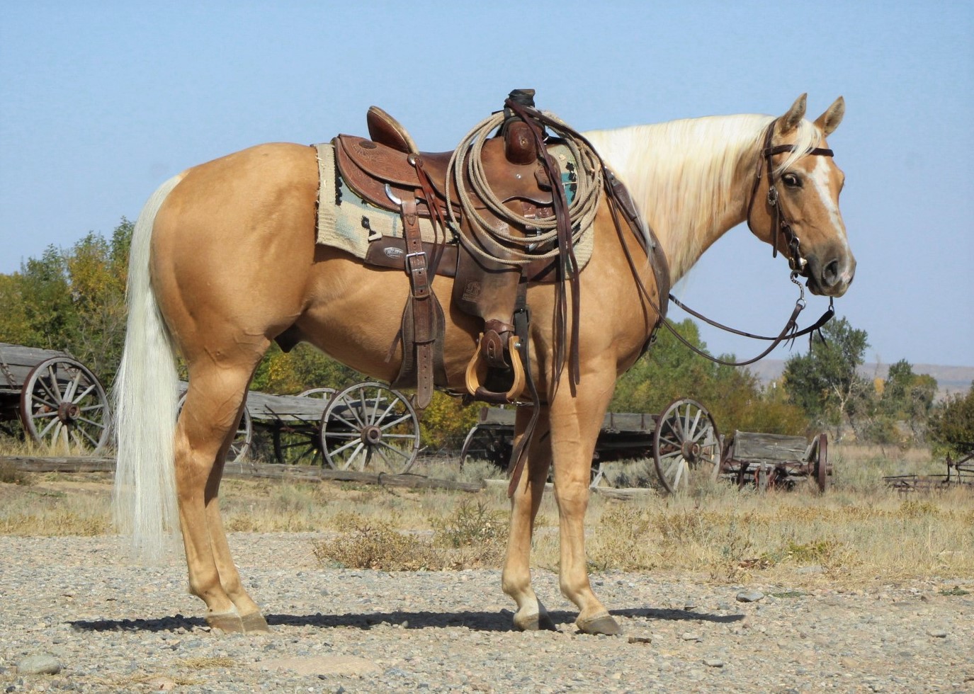 SHINERS PLAYIN ACRE – 2016 AQHA Palomino Gelding x Shiners Crème Bar x Shiners Ace out of Playin Acre x Playin Stylish. Talk about FANCY! Shiner is just that SHINEY. He has gorgeous conformation, thick made, baby doll head, soft kind eye, big round hip topped off by that beautiful palomino color. Shiner stands out in any crowd and he’s the first one that catches everyones eye. Not only is he shiney to look at look at, he is HANDY broke too. He has a reining foundation and then we have put him to work on the ranch. Excellent one handed neck rein, lopes out of his tracks soft and level headed. He will lope pretty circle and stops nicely on the hind end. He is soft in the bridle, moves off of your legs. Opens and closes gates with ease when working in the alleys. We have used him all over the ranch, done every aspect of ranch work, drug calves to the fire this spring, used him checking herd this summer and riding in rough and rocky terrain, this fall we have taken him up in the mountains hunting and used him for a pack horse. He stays broke with time off, easy to catch even out on pasture. He has good ground manners, easy to shoe. Loads in and backs out of the trailer, hauls well. Shiner is one Fancy guy that you are going to love, whether you are looking for a horse to go show, work on the ranch, or take on a trail ride he is the kind that will do it all. For more information call 307-250-9655.
