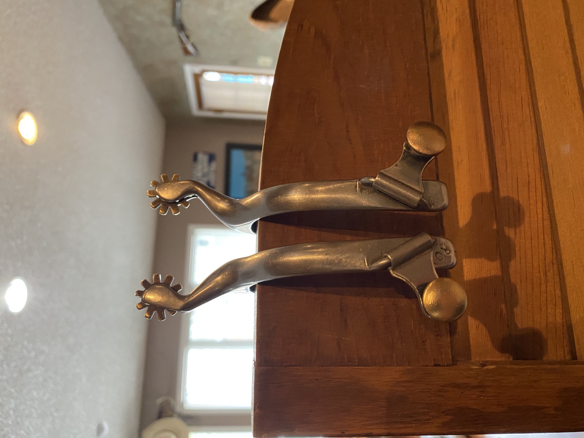 ROY stainless steel roping spurs. Full size roping spurs in good shape. 1/2” bands, 1 3/4” shanks, 3/4” 10 point brass rowels. These have about a 3 inch heel spread.. Typical ROY stamp on each side of both spurs.