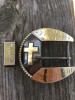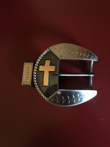 Handmade belt buckle and keeper by Ray Castleberry of Madill, OK. I am the maker of this buckle. This buckle and keeper are made for a 1 1/2" belt. It has a gold toned cross. This buckle measures 3 1/2" x 3 1/2". I accept Paypal or cash. Call or text.