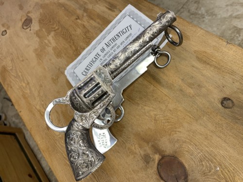 Engraved silver 45 pistol bit stamped and numbered. Medium port bit with inlay copper on backside of bit piece. Sells with certificate of authenticity