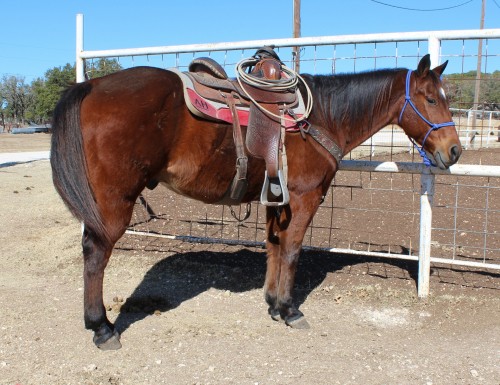 If you are looking for a gentle, quiet well broke ranch gelding that the entire family can enjoy, then take a look at Jingles. He is a nice looking 15 year old bay gelding, 15.2 hh and close to 1250 pounds, with four black feet, a ton of bone, and a pretty head with a kind eye. H sells as GRADE. He has been on the same ranch for the majority of his life, ridden by the foreman, until he turned 75 and could no longer mount a horse this tall. Jingles has been used for all phases of ranch work, including sorting pairs, roping and doctoring cattle in the pasture, and checking fence. Jingles is broke the way one should be, with an excellent neck rein, a soft mouth and a sliding stop. He has the smoothest trot and rocking horse lope that you could ride all day long without getting sore. He would be the perfect horse for a weekend rancher wanting to heck his cows or ride fence, or to keep on the ranch for guests to have a safe horse to ride on. We have had beginner riders ride him all over the ranch and he takes very good care of them. Jingles has excellent ground manners and loves attention, and will come up to you in the pasture to be caught. He is laid back but responsive, content to walk quietly all day long but will easily step into a trot or lope when asked. Jingles has put in his time as a full time ranch hrose and is looking for a family who will spoil him and take care of him in his retirement years. He is sound but will not hold up to the pressure of all day, everyday ranch work, but loves to be ridden and is very willing to do anything you ask of him. Jingles can be ridden out by himself or with other horses, and has been ridden alongside the road and in traffic and isn’t bothered by it. Asking $4500. Jingles stands quietly tied, and is easy to catch, load, haul and shoe. Call for more information: Aubrey at 830-377-7236 or Wendy at 210-363-1883. Serious inquiries only, no tire kickers! Delivery anywhere is the US is available at a reasonable price.