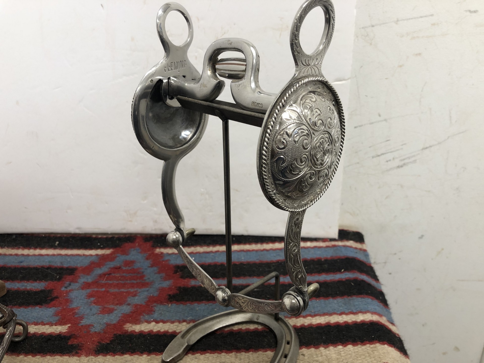 FLEMING marked bit in very good condition with 3 1/4" conchos, 7 3/4" cheeks, 5" mouth, marked mexico on mouth. Classy piece to use or add to a collection. We pay shipping within the 48 states. We accept most forms of credit card, Pay Pal, money order, or check.