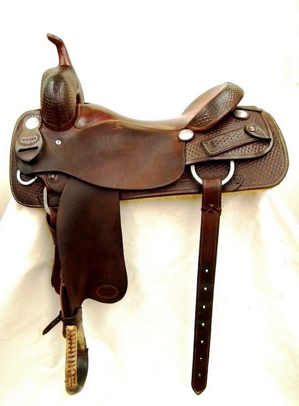 John Piland original saddle. It is a 7/8 rigging, 17" seat, 9 "swells, 3" cantle, 4" high horn with a 1 3/4 cap and a 6 3/4 gullet.