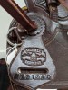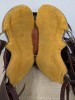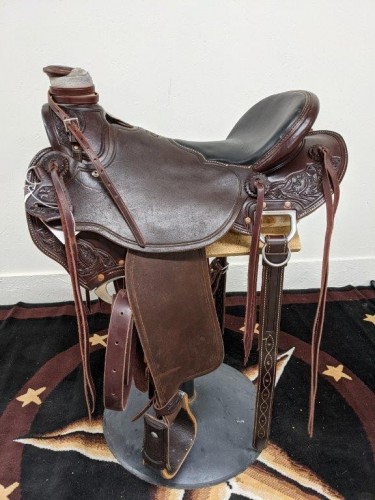 This lightweight and durable Wade Saddle is ready for all day riding or working some cows. Been used a handful of times - Handsomely colored with a dark chocolate oil, it has a black padded seat, and rounded single skirt. Finished out with a Cheyenne cantle, horn wrapped with mule hide, and back cinch.