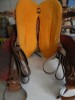 Handmade Wade saddle. Roughout with rope border stamp. Rawhide cantle binding with brass tacks. Matching breast collar. All stainless steel hardware. Quality leather and sheep skin. Wood and rawhide tree. I have been riding this saddle for about 2 years. It is in great condition. Just getting broke in.