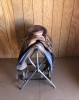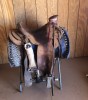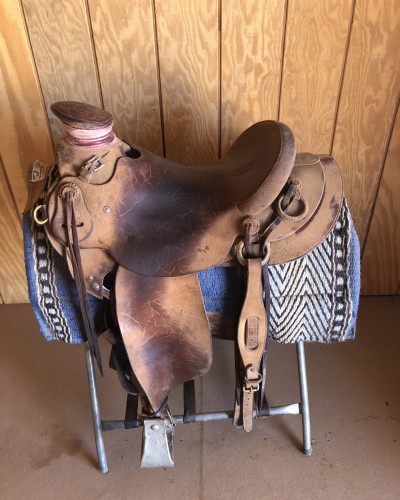 Custom made by John Willemsma LJ Saddlery. This is a rough out Wade saddle with 15” seat that has tooled cantle and horn. It has mule hide horn wrap and Monel stirrups.This is a great using saddle and has been well taken care of.