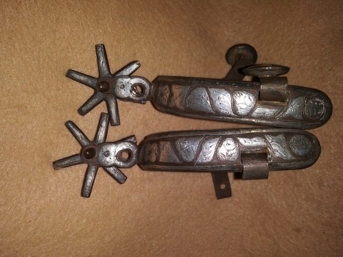 Early Handmade Chihuahua style spurs. They are double mounted with inlaid engraved silver on the bands, shanks and rowels. A friend of mine got these spurs in Mexico in the early 1970s and I got them from him about 1985. They were old when he got them. The leather buttons are missing on one spur. The hangers are there. They can be made out of a couple of old bolts if you want. They are really neat old spurs. Priced at $150. SALE PENDING