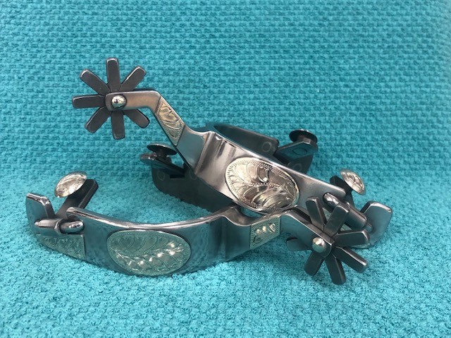 Steidley marked spurs made by Northeastern Oklahoma maker Kenny Steidley, stamped 208 inside the bands. These are new spurs with
