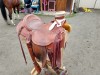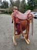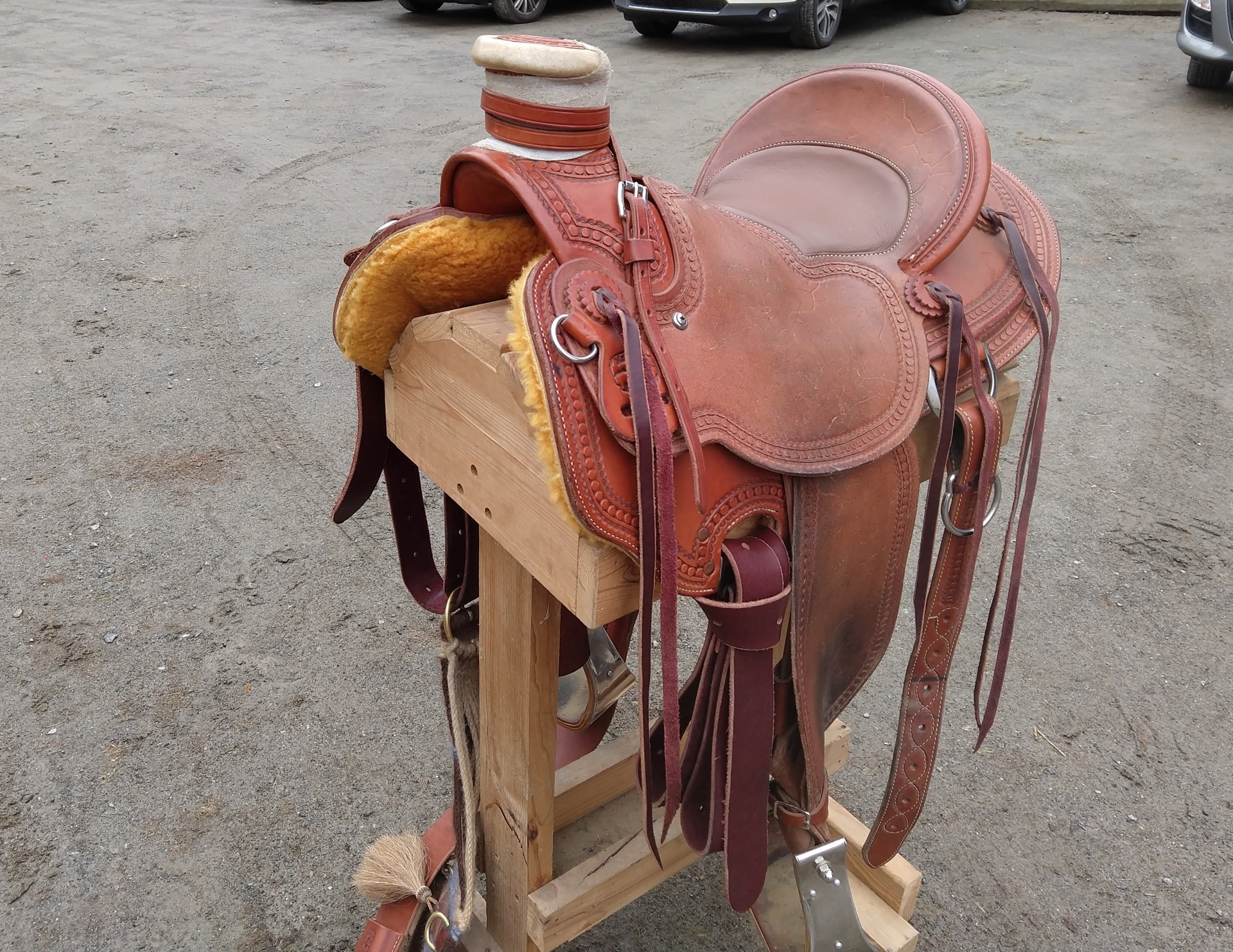 Roughout, small inlayed padded seat, meidum oil finish, mule hide wrapped horn, cross-over rope strap, dot boarder/part tooling, 3" Monel stirrups, back cinch, stainless rigging, 2" leather conchos