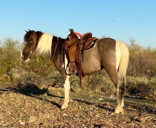 Not your typical pony! Get your hand in the air for this one-of-a-kind kid approved 10.2 HH 9-yro flashy paint pony mare! Can be caught, saddled and bridled by a kid! Rides out alone, single or double. Solid on the trail, around cows, in the arena or over jumps! Has 3 nice gaits, pushes cows and safely crosses water and bridges! You won’t beat “Friendly” as a confidence builder or step-up pony!